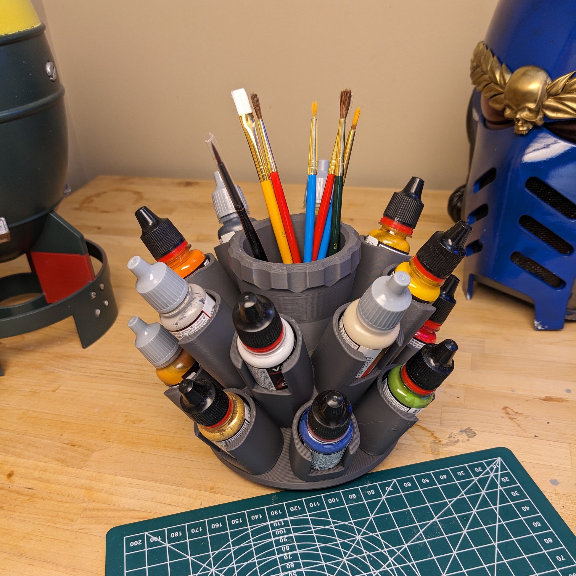 Keep your paints and brushes neatly organized with this rotating model paint carousel, designed specifically for miniature painters and hobbyists! This compact and efficient storage solution holds 16 paint bottles along with space for paintbrushes, keeping your workspace tidy and your supplies easily accessible.